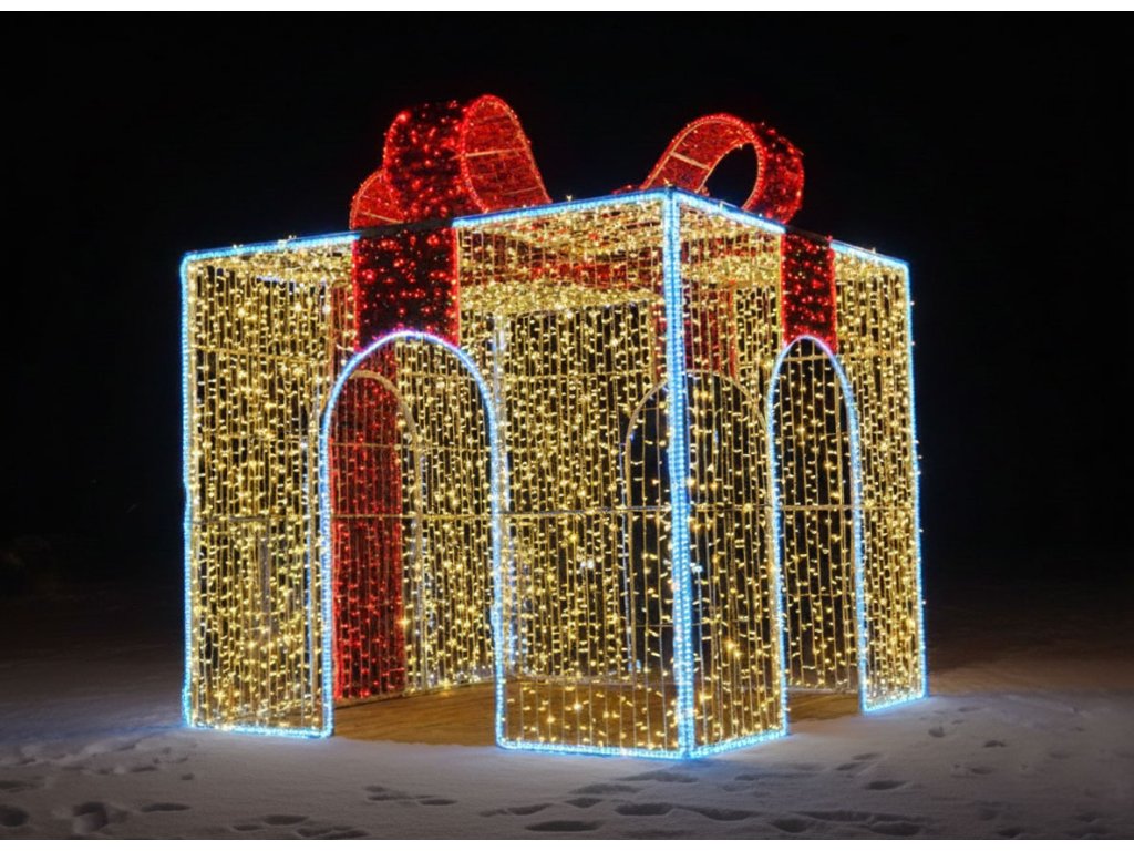 Vánoční LED dárek (300 × 380 × 300 cm) je působivá světelná dekorace, která může sloužit jak jako průchozí brána, tak i jako fotopoint. Tento impozantní 3D světelný prvek je navržen tak, aby vynikl na náměstích, adventních trzích, veřejných prostranstvích a v komerčních centrech. Díky své pevné konstrukci (113 kg) je stabilní i v exteriéru, a jasné LED osvětlení vytváří magickou atmosféru, která přitáhne návštěvníky a podpoří sdílení na sociálních sítích.