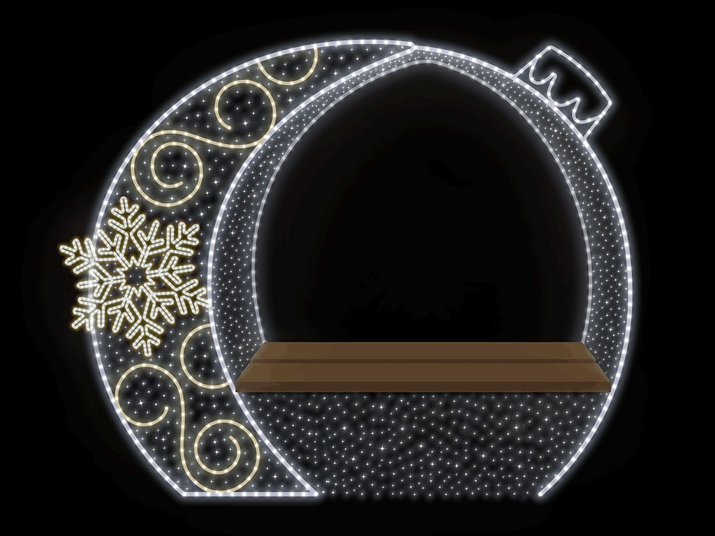 Vánoční LED koule s lavičkou (Š 225 × V 180 × H 60 cm) je multifunkční světelná dekorace, která spojuje estetiku a praktičnost. Tento unikátní prvek slouží nejen jako fotopoint, ale i jako lavička pro posezení, což vytváří interaktivní prvek pro návštěvníky vánočních trhů, náměstí a veřejných prostor.