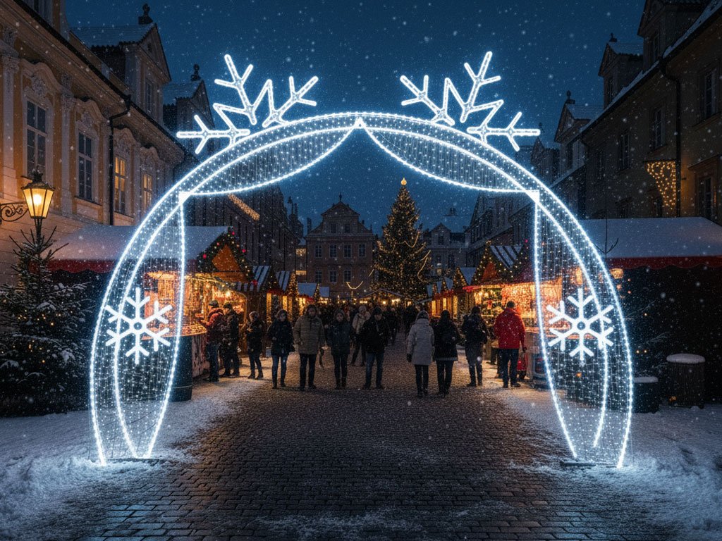🎄 Vánoční LED průchozí brána s vločkami je ideálním prvkem pro obce, města a technické služby, které chtějí vytvořit atraktivní sváteční atmosféru. Skvěle poslouží jako dominantní vstupní brána i jako fotopoint, kde si návštěvníci pořídí krásné zimní fotografie.