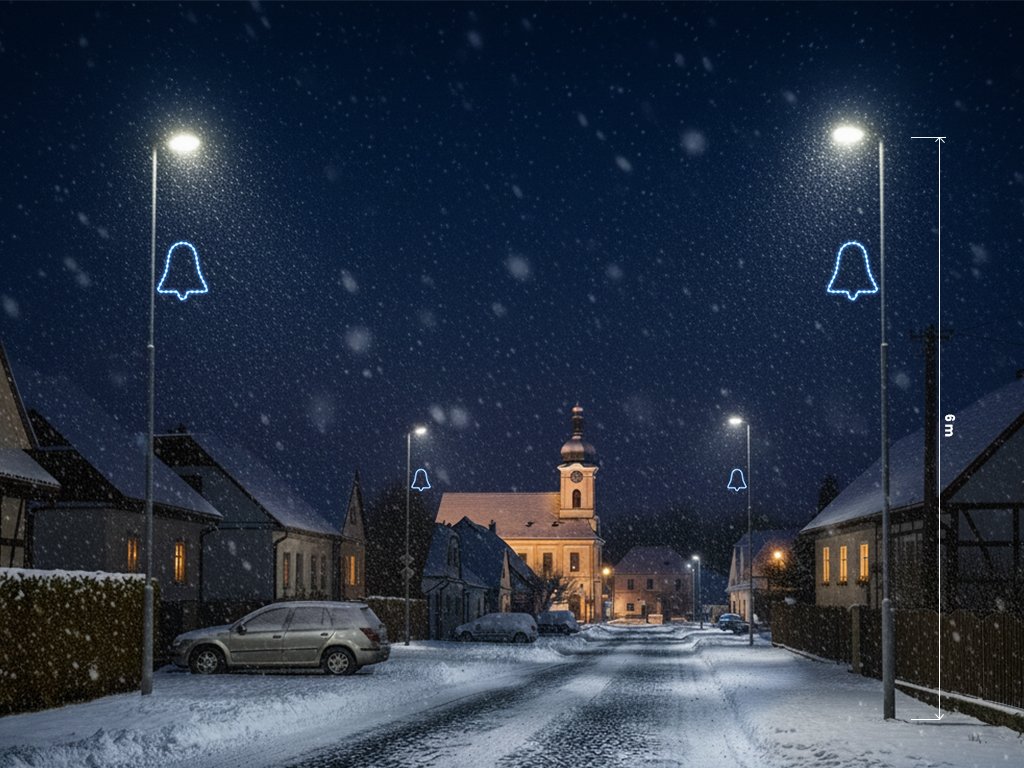 Dodá vašemu městu nebo obci sváteční atmosféru! Tento dekorativní LED zvon je navržen pro instalaci na stožáry veřejného osvětlení a zaujme svou jemnou světelnou kresbou.