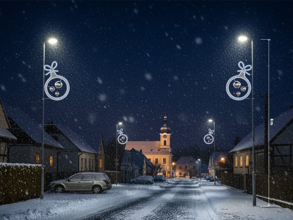 Vánoční dekorace na sloupy veřejného osvětlení Ornament 12, 130 cm, je kouzelný symbol Vánoc, který rozzáří každou ulici. S moderní LED technologií, která šetří až 70 % energie, vytvoří efektivní a dlouhodobé vánoční osvětlení. Design je propracovaný do detailu, přinášející dynamický a elegantní vzhled viditelný z více stran. Ornament 12 lze snadno upevnit na sloup veřejného osvětlení, kde jeho zářivý efekt a precizní zpracování vyniknou.