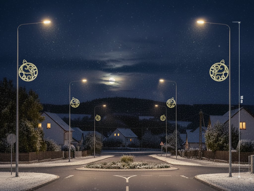 Vánoční dekorace na sloupy veřejného osvětlení Ornament 16, 120 cm, je kouzelný symbol Vánoc, který rozzáří každou ulici. S moderní LED technologií, která šetří až 70 % energie, vytvoří efektivní a dlouhodobé vánoční osvětlení. Design je propracovaný do detailu, přinášející dynamický a elegantní vzhled viditelný z více stran. Ornament 16 lze snadno upevnit na sloup veřejného osvětlení, kde jeho zářivý efekt a precizní zpracování vyniknou.