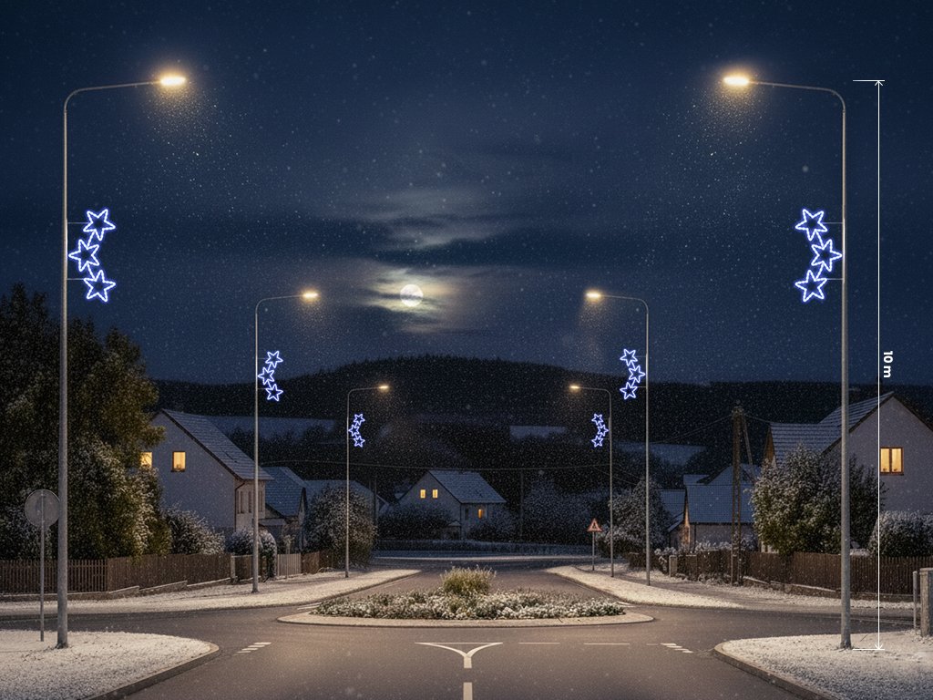 Vánoční dekorace na sloupy veřejného osvětlení Ornament 5, 150 cm, je kouzelný symbol Vánoc, který rozzáří každou ulici. S moderní LED technologií, která šetří až 70 % energie, vytvoří efektivní a dlouhodobé vánoční osvětlení. Design je propracovaný do detailu, přinášející dynamický a elegantní vzhled viditelný z více stran. Ornament 5 lze snadno upevnit na sloup veřejného osvětlení, kde jeho zářivý efekt a precizní zpracování vyniknou.