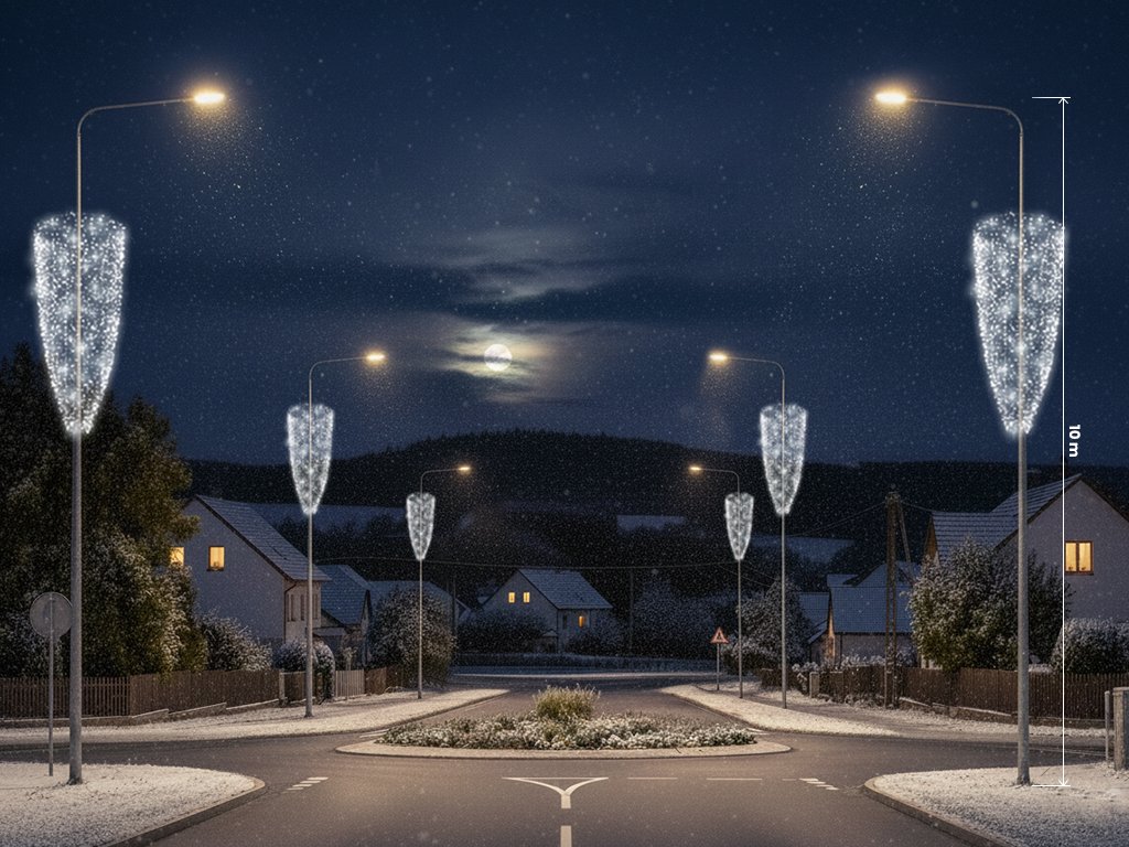 Vánoční dekorace na sloupy veřejného osvětlení Ornament 7, 300 cm, je kouzelný symbol Vánoc, který rozzáří každou ulici. S moderní LED technologií, která šetří až 70 % energie, vytvoří efektivní a dlouhodobé vánoční osvětlení. Design je propracovaný do detailu, přinášející dynamický a elegantní vzhled viditelný z více stran. Ornament 7 lze snadno upevnit na sloup veřejného osvětlení, kde jeho zářivý efekt a precizní zpracování vyniknou.