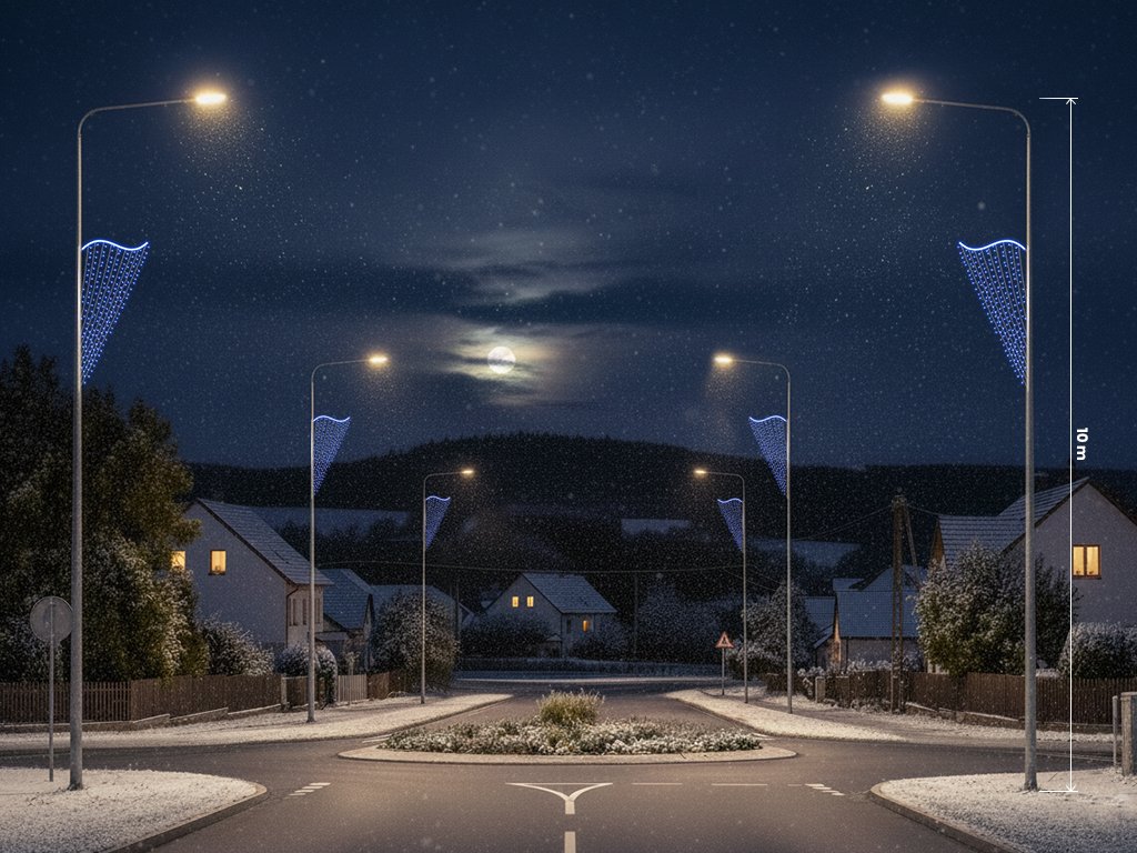 Vánoční dekorace na sloupy veřejného osvětlení Ornament 8, 200 cm, je elegantní a energeticky úsporná volba pro veřejné prostory. Díky moderní LED technologii, která šetří až 70 % energie, nabízí efektivní a dlouhodobé osvětlení, které přitahuje pozornost. Tento design je detailně propracovaný, s LED řetězem, který přidává dekoraci elegantní a kouzelný vzhled viditelný z více stran. Ornament 8 lze snadno upevnit na sloup veřejného osvětlení, kde jeho zářivý efekt a pečlivé zpracování vyniknou.