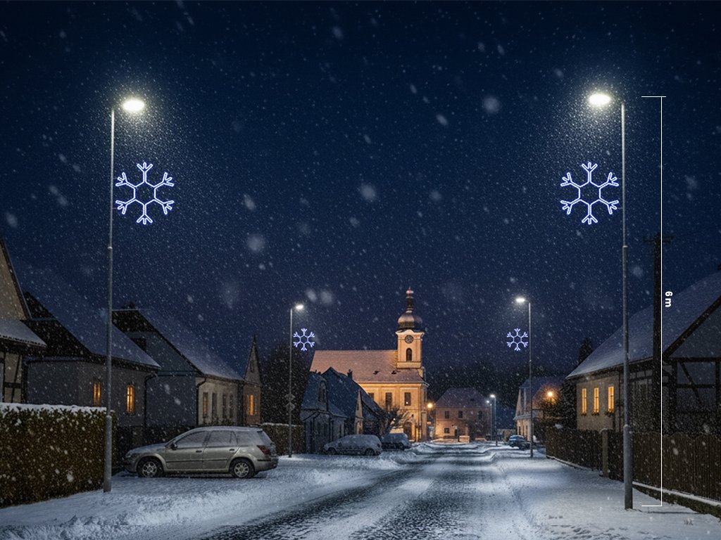 Vánoční dekorace na sloupy veřejného osvětlení Vločka 2 je elegantní a energeticky úsporné řešení pro veřejné prostory. Díky moderní LED technologii šetří až 70 % energie a vytváří kouzelnou vánoční atmosféru. Vločka 2 je velice detailně propracovaná dekorace s kombinací několika barev, ideální pro výzdobu měst, obcí a nákupních center.