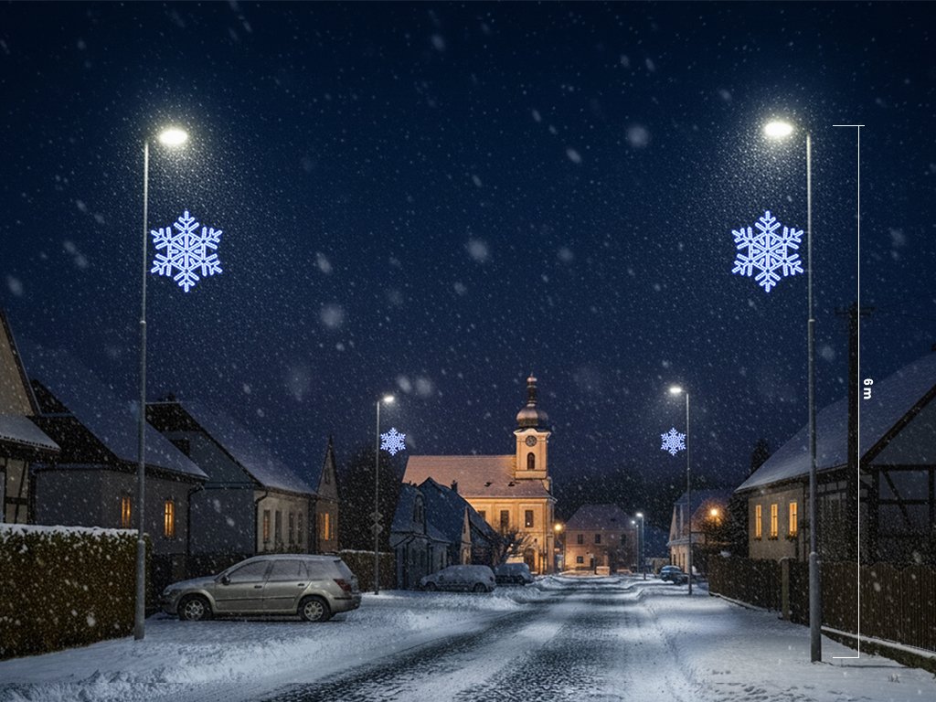 Vánoční dekorace na sloupy veřejného osvětlení Vločka 4 je elegantní a energeticky úsporné řešení pro veřejné prostory. Díky moderní LED technologii šetří až 70 % energie a vytváří kouzelnou vánoční atmosféru. Vločka 4 je velice detailně propracovaná dekorace s kombinací několika barev, ideální pro výzdobu měst, obcí a nákupních center.