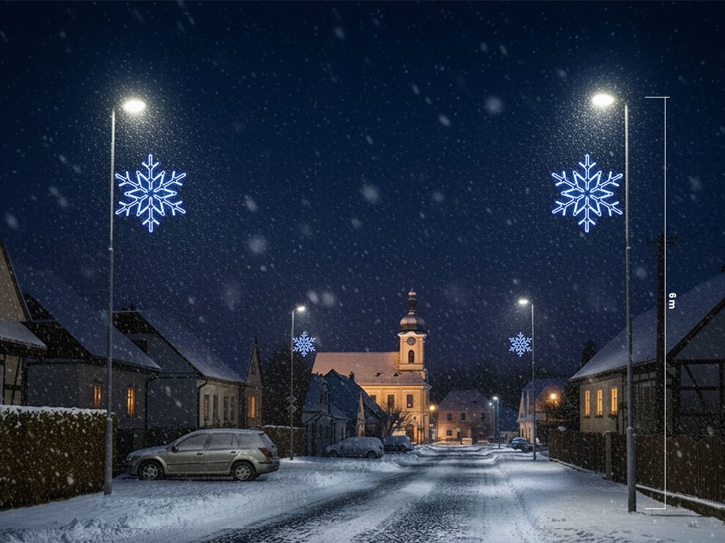 Vánoční dekorace na sloupy veřejného osvětlení Vločka 7 je elegantní a energeticky úsporné řešení pro veřejné prostory. Díky moderní LED technologii šetří až 70 % energie a vytváří kouzelnou vánoční atmosféru. Vločka 7 je velice detailně propracovaná dekorace s kombinací několika barev, ideální pro výzdobu měst, obcí a nákupních center.